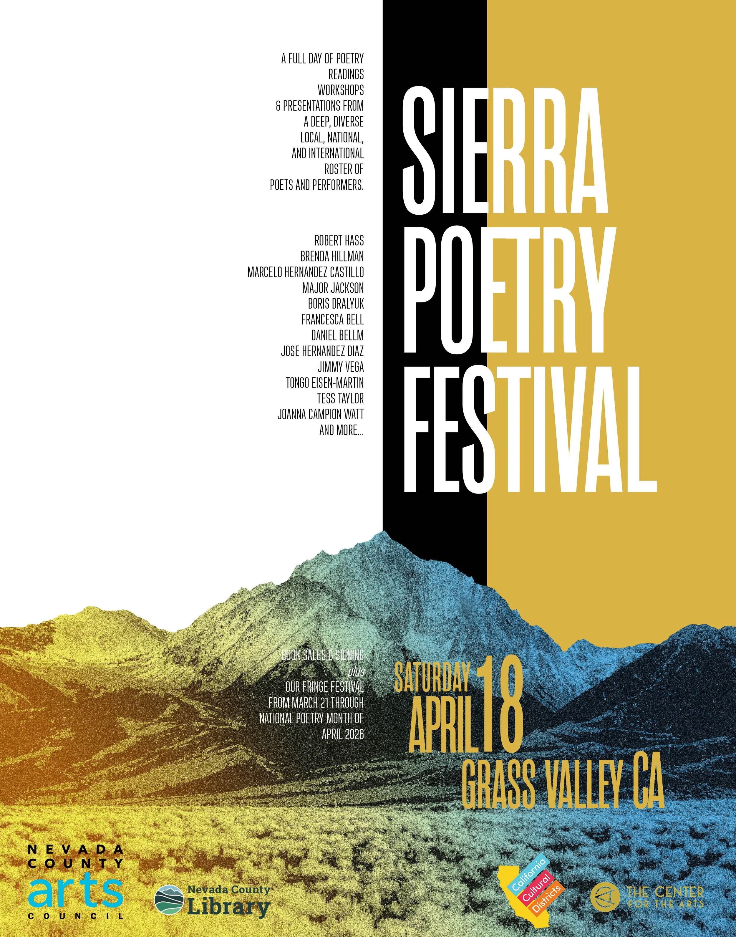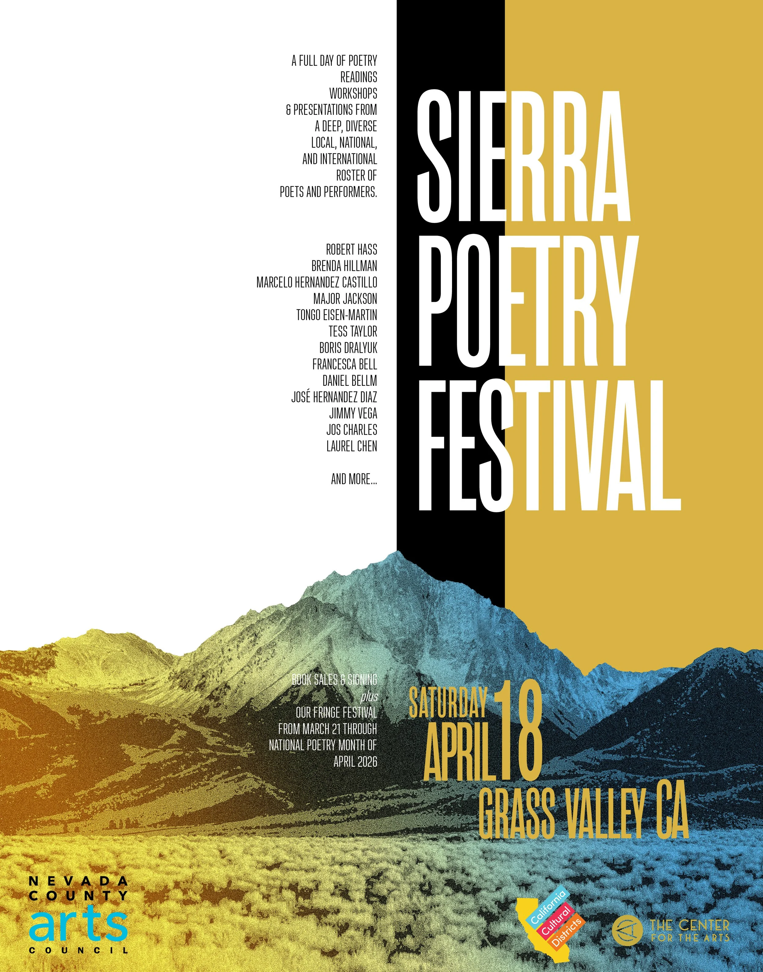 Sierra Poetry Festival is a project of Nevada County Arts Council. This year’s mainstage event will take place on April 18, 2026, at The Center for the Arts, in Grass Valley, CA, attended by some of our most exciting local, national, and international poets and performers. PLUS, more than a month of pop-up poetry events, free and open to the public.